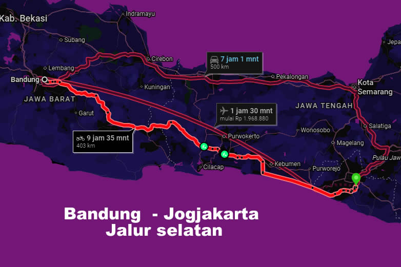 Bandung → Cileunyi → Cicalengka → Ciawi → Tasikmalaya → Banjar → Cilacap → Kebumen → Purworejo → Wates → Jogjakarta