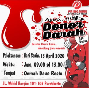Bila anda sehat, ingin membagikan setetes darah bagi kemanusiaan dan sekaligus memeriksakan diri apakah kita dalam kendisi sehat atau tidak. Ingat donor darah bagi kemanusiaan ingat Donor Darah tanggal 13 april 2020 jam 09.00 – 10.30, untuk umum pmulai jam 10.30 – 13.00. Tempat kegiatan di di Oemah Daun Resto jalan Wahid Hasyim no. 101-103 Purwokerto.